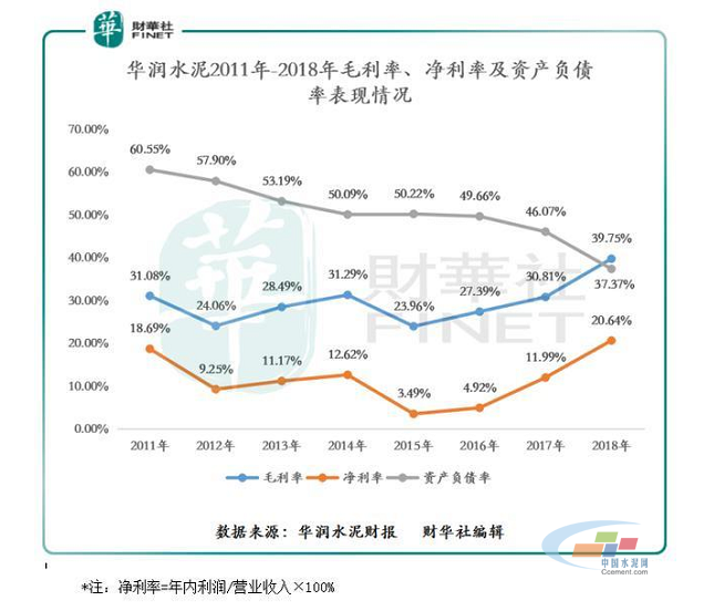 值得注意的是,雖然公司凈利潤再持續(xù)走強(qiáng),但公司整體的總資產(chǎn)規(guī)模年復(fù)合增速變化并不大。 截至2018年底,華潤水泥的資產(chǎn)規(guī)模從2011年的409.06億元增至2018年的530.16億元,年復(fù)合增長率為3.77%。同期,兩廣市場主要競爭對手海螺水泥的總資產(chǎn)年復(fù)合增長率卻達(dá)到8.58%,其年復(fù)合增速遠(yuǎn)高于華潤水泥。這主要原因是在2011年華潤水泥大舉進(jìn)軍廣東市場后,公司至今新熟料生產(chǎn)線投入較少且并購項(xiàng)目也是寥寥無幾。反觀海螺水泥,近些年受去產(chǎn)能化及混改等政策為驅(qū)動,頻頻發(fā)起并購重組的資本操作。 盈利能力不斷走強(qiáng),債務(wù)結(jié)構(gòu)良好 華潤水泥的資產(chǎn)規(guī)模增速較行業(yè)競爭對手增速雖有所放緩,但公司經(jīng)營業(yè)績在不斷轉(zhuǎn)優(yōu)這是不可否認(rèn)事實(shí)。經(jīng)營業(yè)績的持續(xù)走強(qiáng),考量公司經(jīng)營業(yè)績核心財(cái)務(wù)指標(biāo)也在不斷向好。 截至2018年底,公司毛利率從2011年的31.08%增至2018年的39.75%。其中毛利率從2015年低點(diǎn)的23.96%增長15.79個(gè)百分點(diǎn)至2018年的39.75%,主要是受期間內(nèi)公司增強(qiáng)成本、資本開支的管控,同時(shí)期間內(nèi)水泥價(jià)格走高等因素影響,推動公司毛利率從2015年的53.76億元增至2018年的135.11億元,年復(fù)合增速高達(dá)35.95%。 公司毛利率持續(xù)高走,一定程度帶動核心凈利率的增長。截至2018年,凈利率從2011年的18.69%增至2018年的20.64%,整體凈利率表現(xiàn)創(chuàng)出近10年最佳表現(xiàn)。 ![]()